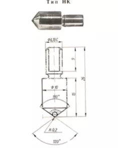 Наконечник типа НК с рабочей частью в виде конуса к прибора для измерения твердости по методу Роквелла НК. Применяются при определении твердости в твердомерах по методу Роквелла или Супер-Роквелла наравне с твердосплавными наконечниками.